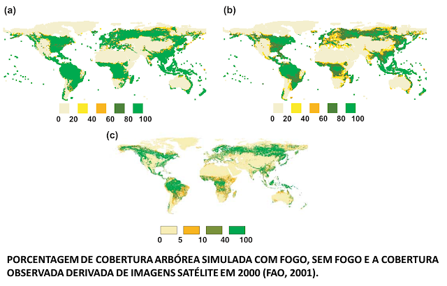 Os modelos de simulação da vegetação em escala global (similares aos usados para predizer as mudanças climáticas) não reproduzem os biomas terrestres a menos que se considere que em muitos ecossistemas os incêndios ocorram de maneira recorrente (ver figura abaixo).